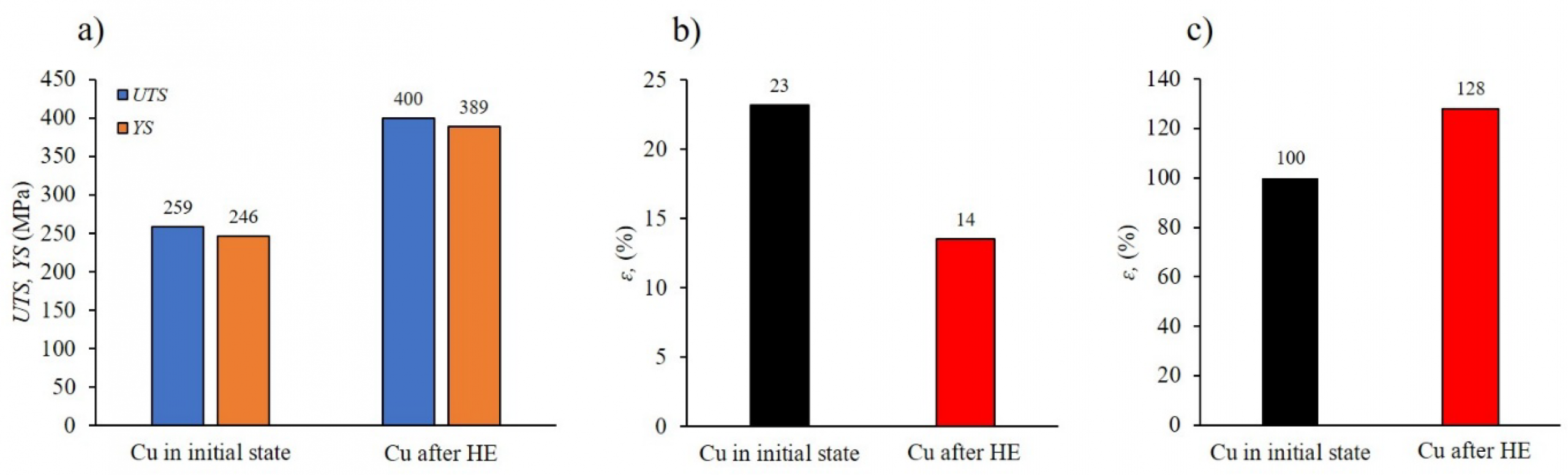 The study focused on improving the properties of high-purity copper (M1E) using a non-conventional hydrostatic extrusion (HE) process. Optimization of the process (total strain ε = 2.51) led to the formation of an ultra-fine-grained structure with an average grain size of about 370 nm, resulting in high mechanical strength (UTS ≈ 400 MPa) while maintaining excellent electrical conductivity (~99% IACS).